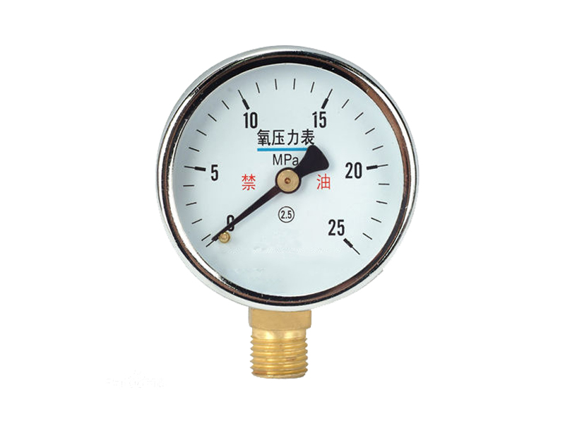 产品说明: 氧气压力表是指用来测定氧气压力的压力表。 压力表测量的是表压因为氧气的强氧化性这一化学性质导致在测氧气压力时需要特殊的压力表,这种压力表就是氧气压力表。氧气压力表国家有明确的规定和指标,简单的来说有两方面的:在生产低部件到组装校验中不能接触任何油脂类产品,表盘有红色禁油标志。