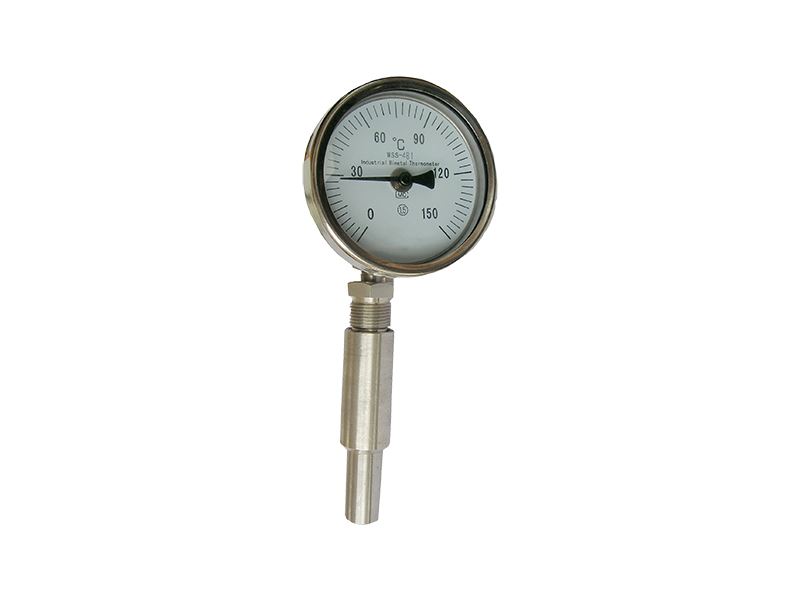 产品说明: 热套式双金属温度计可配合各式安装套管,满足不同压力等级要求。可以直接测量过程中的-80-+500℃范围内液体、蒸汽和气体介质以及固体表面测温。 主要技术参数 标度盘公称直径:100 精度等级:1.0、1.5 連接尺寸:M20x1.5、NPT1/2 热响应时间:≤40s 防护等级:IP55