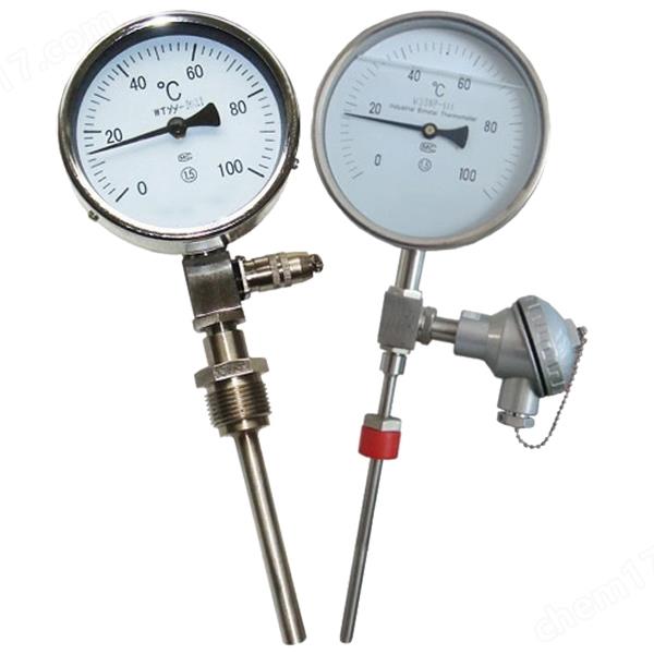 一体化双金属温度计是将热电阻或热电偶的信号远传功能与双金属温度计就地指示功能相结合,它既能满足现场测温需求,亦能满足远距离传输需求,远传双金属温度计可以直接测量各种生产过程中的 -40~+600℃范围内液体、蒸气和气体介质以及固体表面的温度测量。